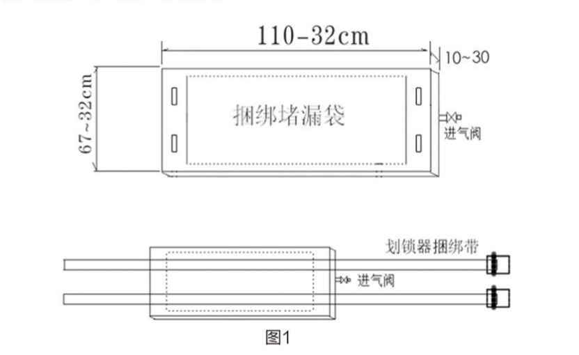 1. 劃鎖器捆綁帶:將規(guī)格為寬25mm,厚2 - 6mm,長為3米高強(qiáng)度滌綸、丙綸、錦綸捆綁帶安裝上五金件劃鎖器成為捆綁充氣橡膠袋的捆綁帶,起名為“劃鎖器捆綁帶”,類同于男人扎的褲腰帶,用劃鎖器捆綁帶穿過充氣外封式堵漏袋(用于捆綁擠壓至泄漏孔上),在外封式堵漏袋與泄漏點(diǎn)之間安裝相應(yīng)規(guī)格的密封板,用于泄漏點(diǎn)的堵漏。